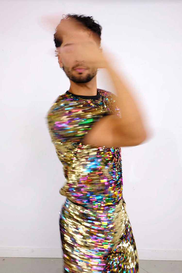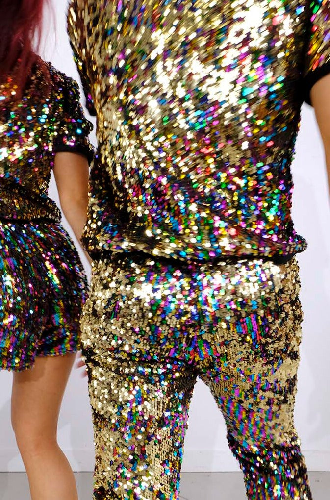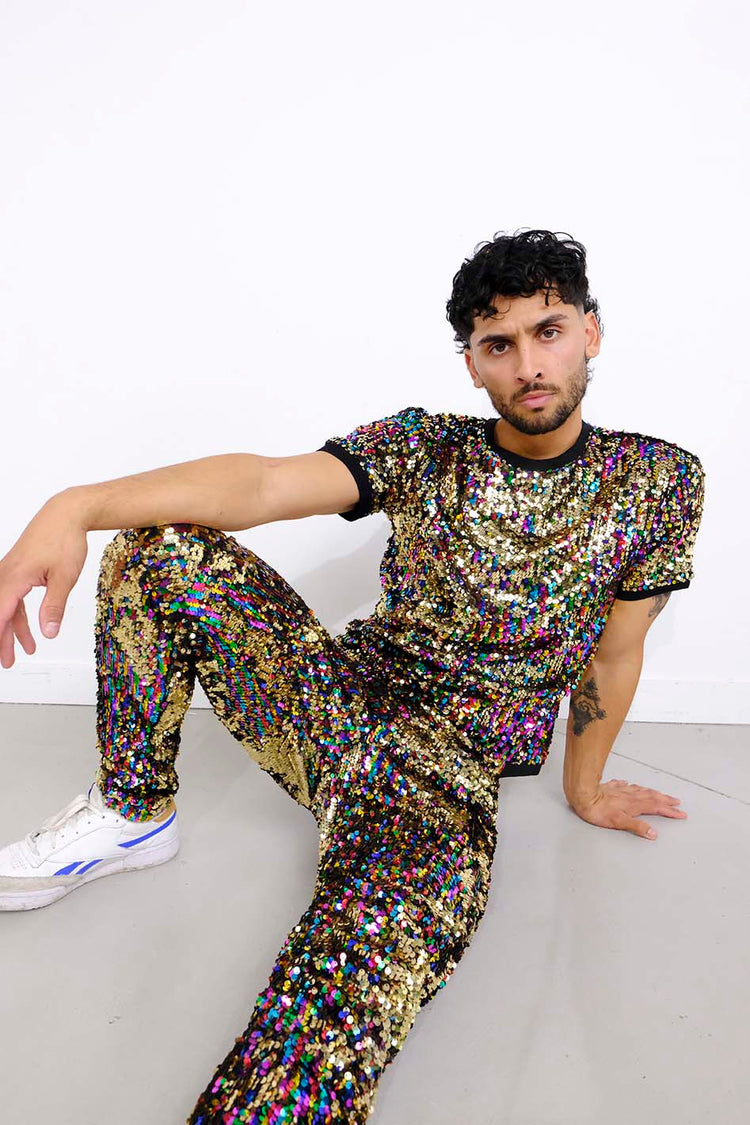 Studio 54 inspired sparkly sequin rainbow gold T-Shirt for those who want to make an entrance.