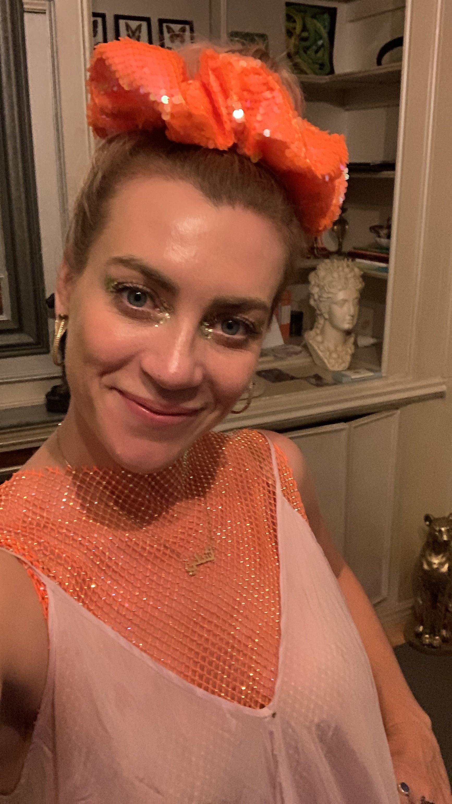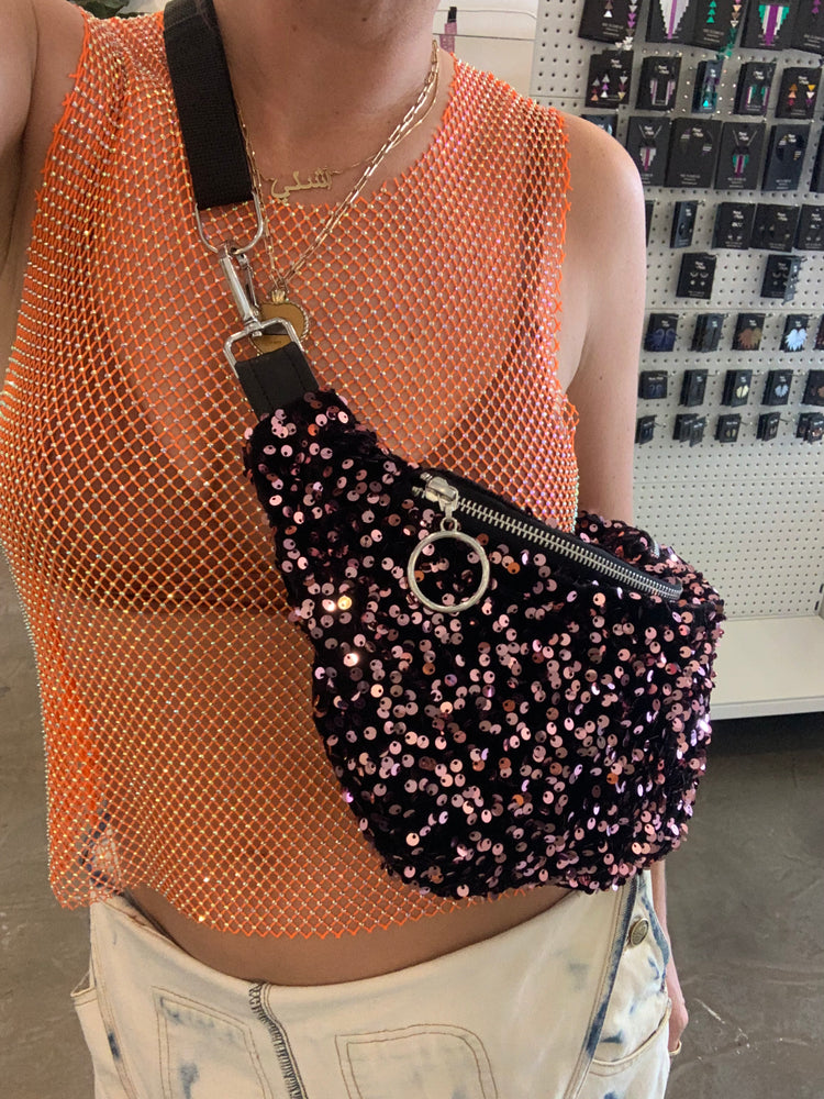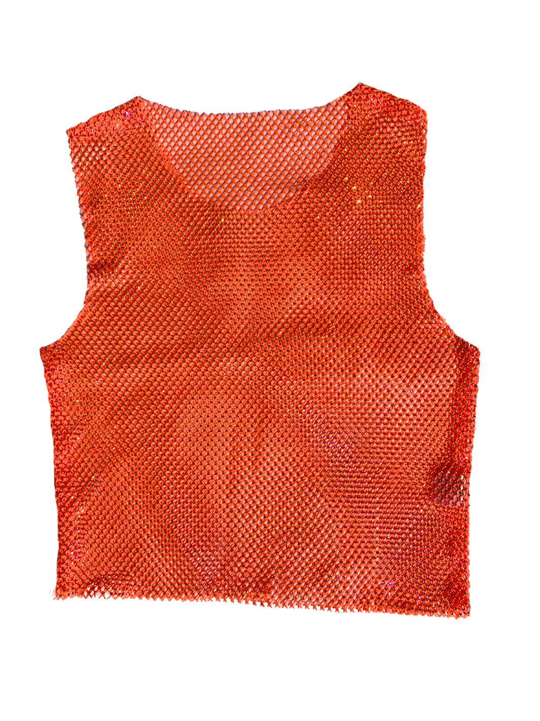 Studio 54 inspired sparkly rhinestone sleeveless top in orange for those who want to make an entrance.