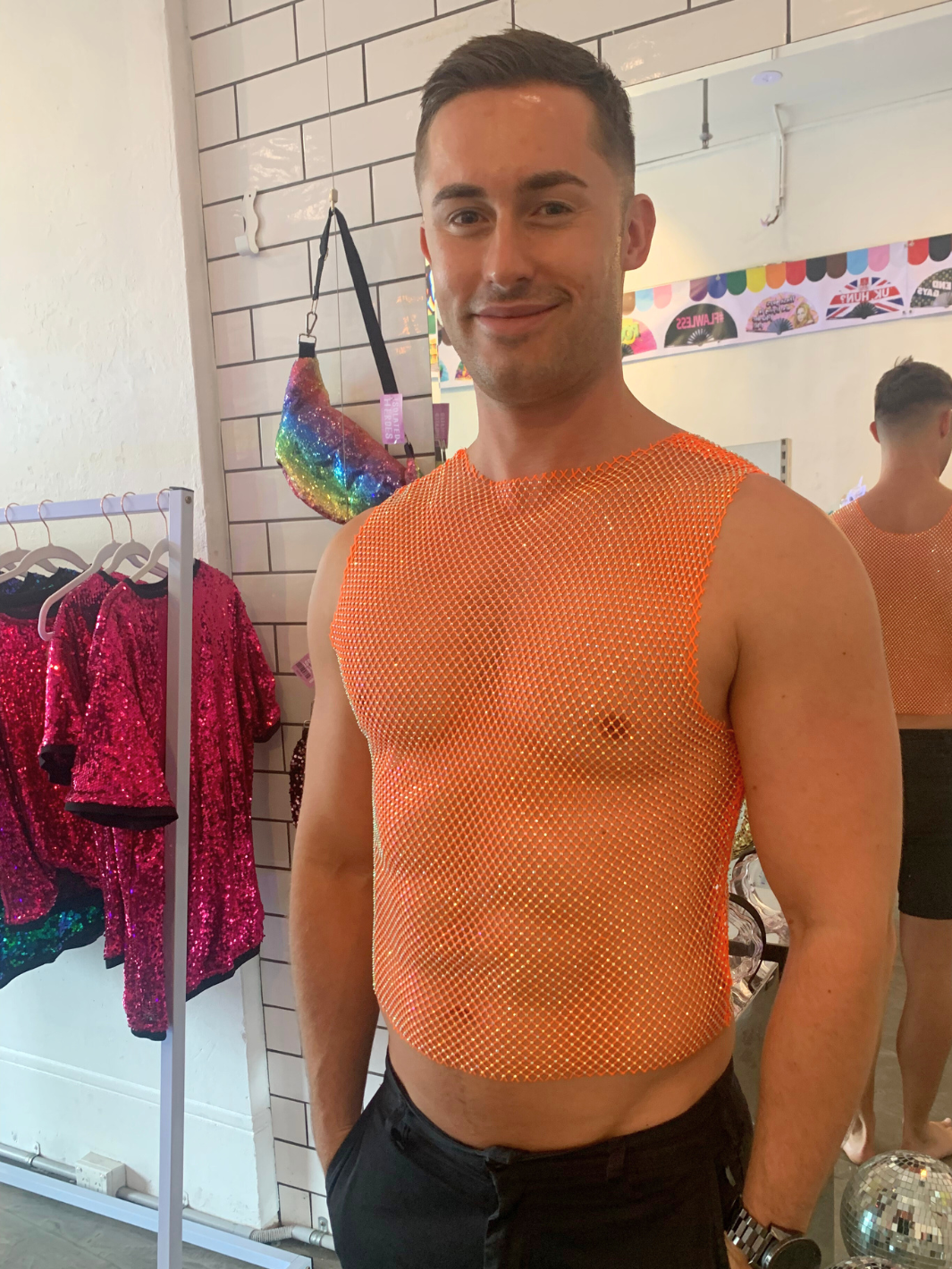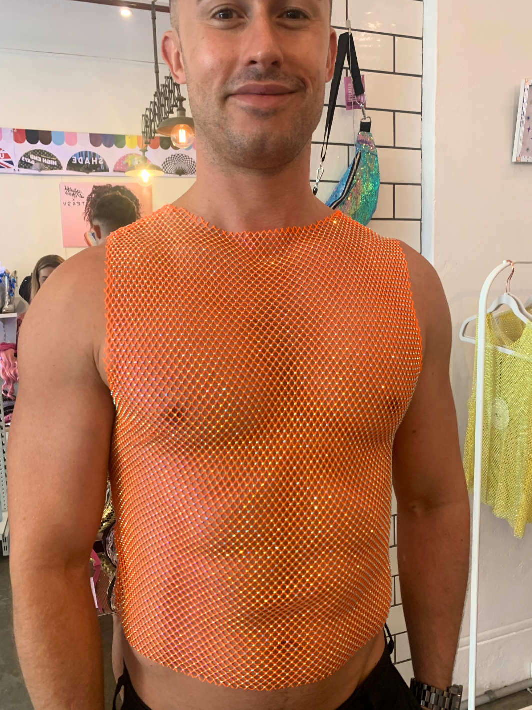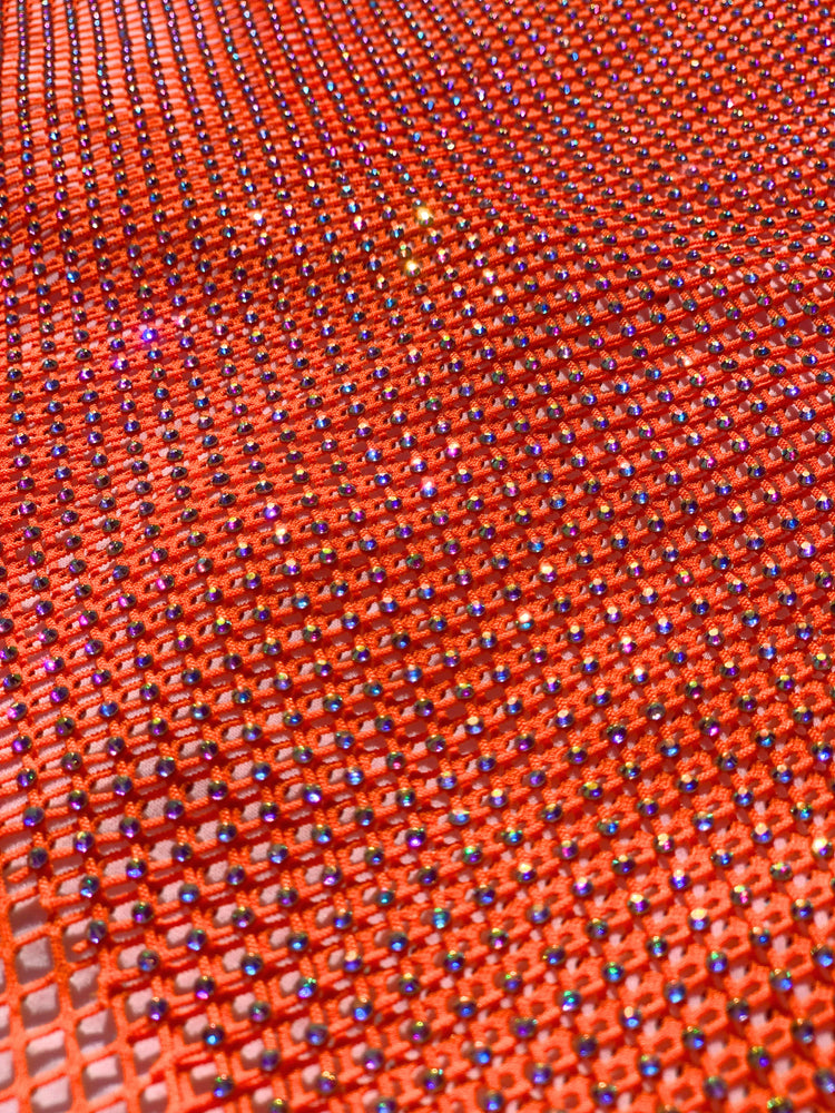 Reversible unisex cut - higher boat neckline or scooped neckline options. Made of a bright orange stretch mesh fabric and covered in thousands of sparkling rhinestones. This comfortable sparkly top was made for dance floors.
