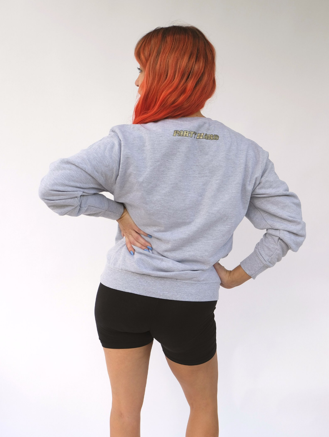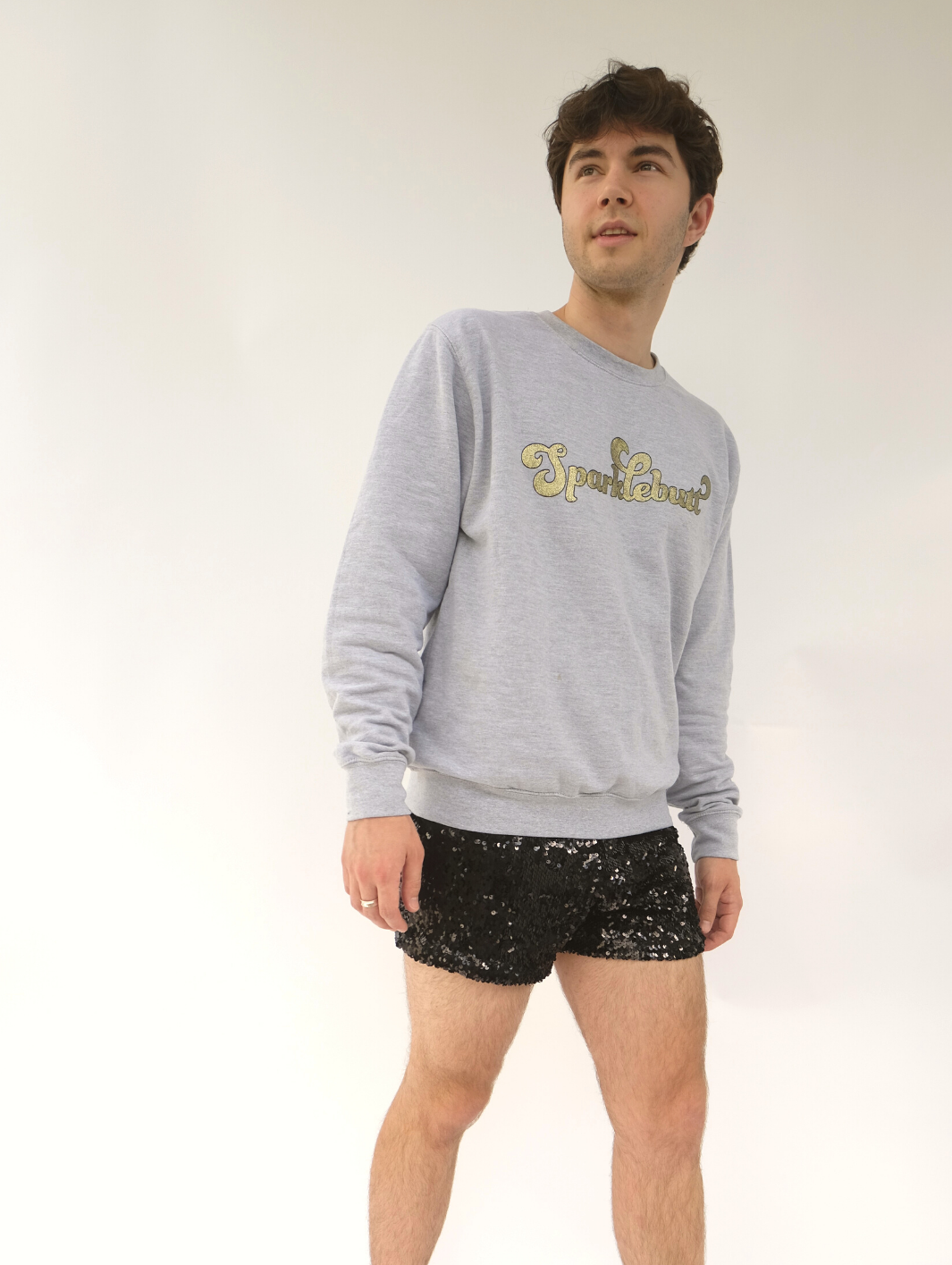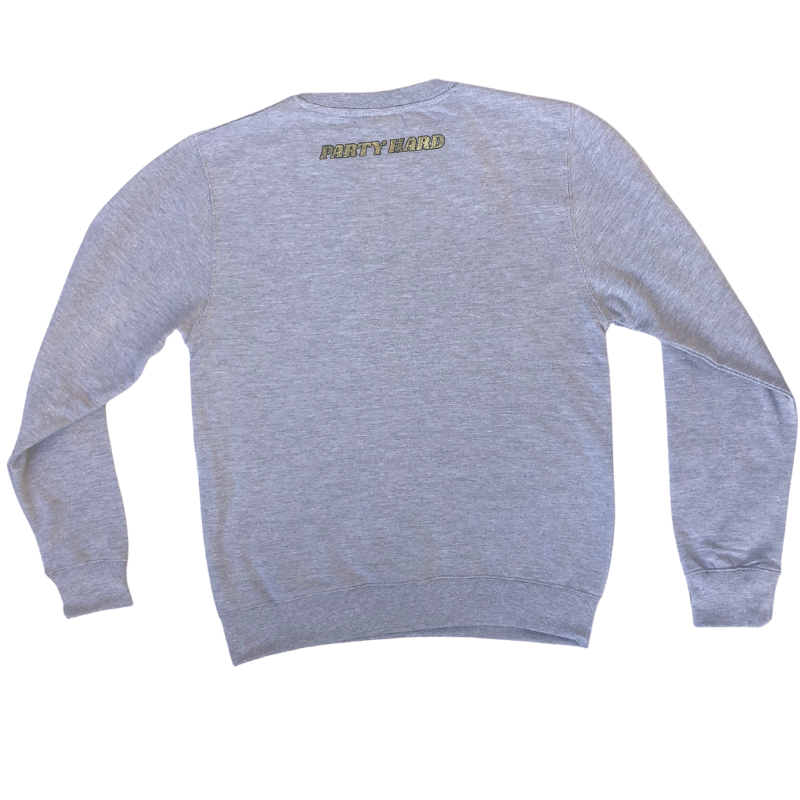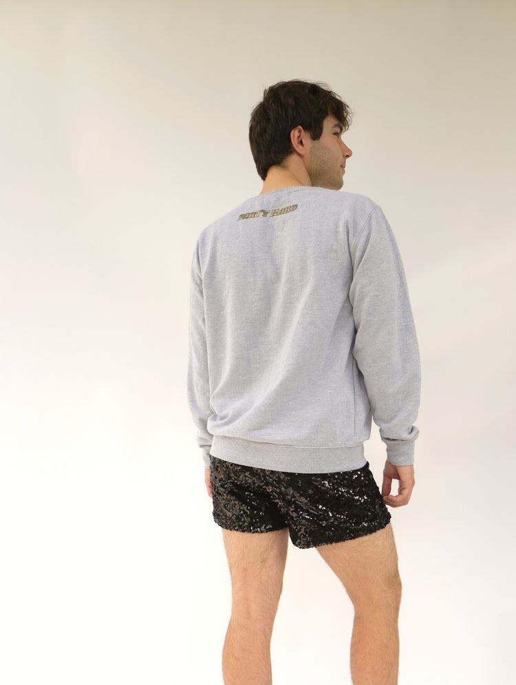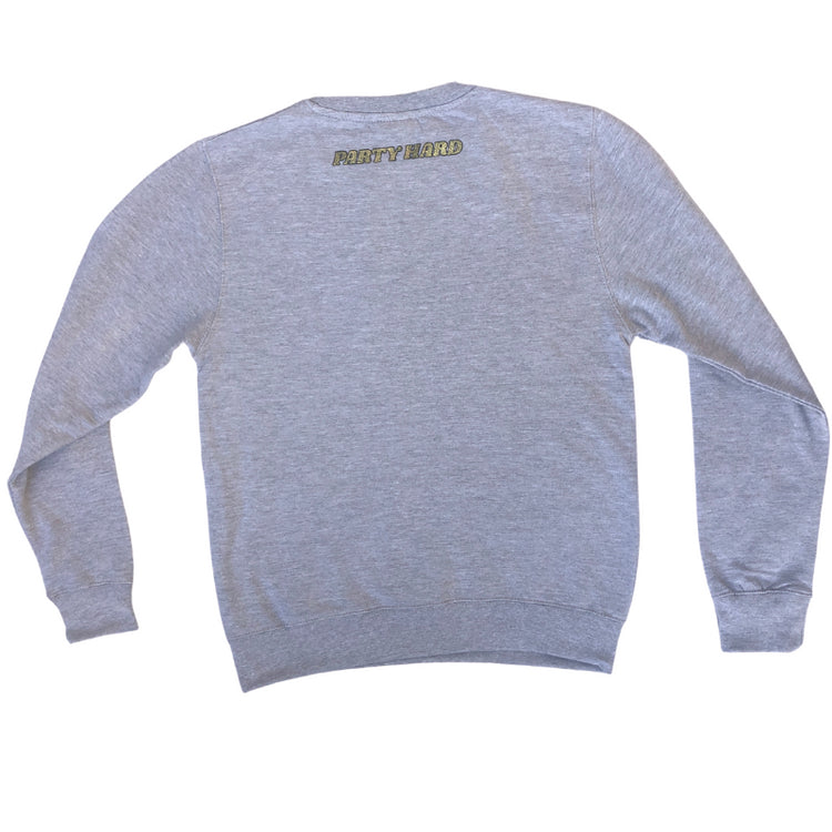 These extra snug Sparklebutt jumpers are perfect for the lounging sparkle-lover. Made of a high quality, heather grey jersey with our Sparklebutt logo screen printed on the chest in a gold glitter ink and a cheeky 'Party Hard' on the back of the neck.