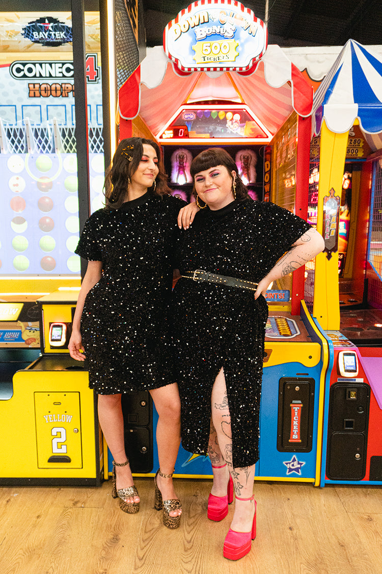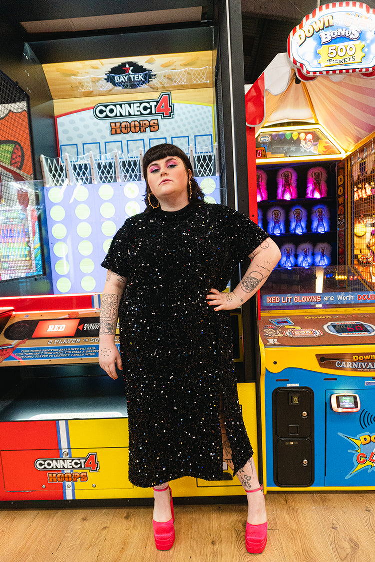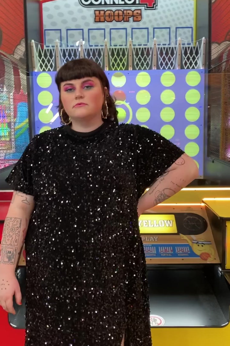 The Isolated Heroes plus size midnight black sequin dress is a showstopper! Mid length batwing t-shirt sequin dress with relaxed fit. Fabric consists of super sparkly black sequins sewn onto a velvet base.